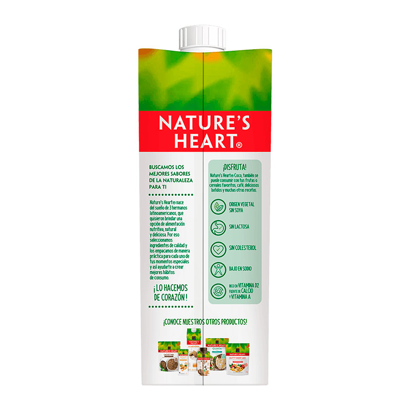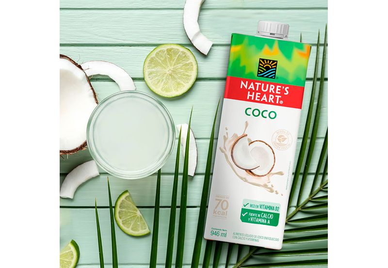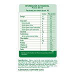 Ingredientes: Agua, crema de coco (extracto de coco, agua, goma xantana y goma guar como estabilizante), jugo evaporado de caña, fosfato tricálcico (estabilizante y aporte de calcio), fosfato dipotásico (emulsificante), lecitina de girasol (emulsificante), sal yodada, saborizante natural de coco, palmitato de retinol(Vitamina A) y Vitamina D2. Alérgenos: Contiene coco.