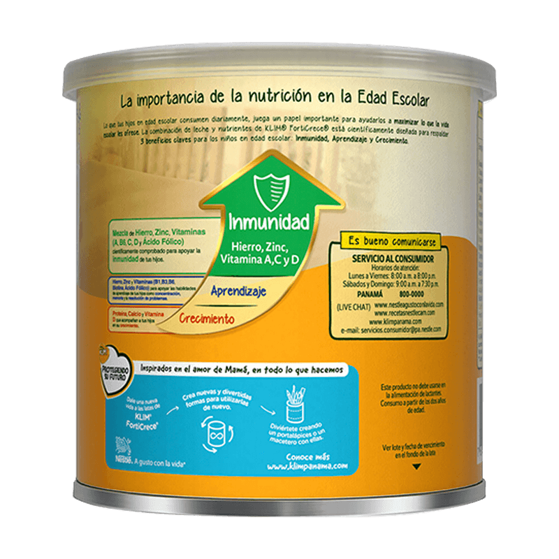 Ingredientes: Leche en Polvo (Leche de vaca, lactosa, lecitina de soya (emulsionante), vitaminas A, C y D), premezcla de vitaminas y minerales (C, E, Niacina, Ácido Pantoténico, B6, B1, Ácido Fólico, Biotina, Pirofosfato de Hierro, Sulfato de Cinc y Sulfato de Manganeso). Alérgenos: Contiene Leche, Lactosa y Derivados de Soya. Este producto puede incluir trazas de Gluten.