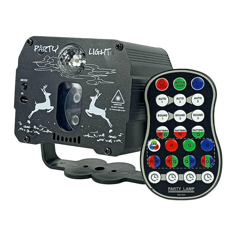 Luz láser portátil de alta calidad con fuentes de luz láser verde y roja, múltiples patrones, dimensiones compactas (87x72x60 mm), aleación de aluminio, alimentada por 5 V con 6W de potencia. Diseño portátil con soporte ajustable y control remoto para una personalización sencilla de la iluminación.