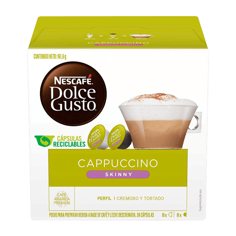 El mismo sabor, intensidad y dulzura del Cappuccino de siempre pero con tan sólo 48 calorías por cápsula. Ingredientes: Cápsula de preparado de leche: Leche descremada en polvo, Emulsificante (Lecitina de Soya). Cápsula de café: Café tostado y molido 100% Arábica.