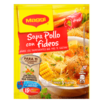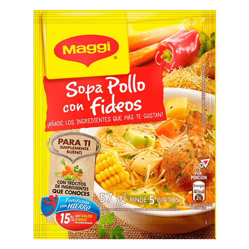 Pasta de trigo (66%), sal yodada, almidón de maíz, acentuadores de sabor (glutamato monosódico, guanliato disódico, inosinato disódico), vegetales 3,3% (cebolla, zanahoria, ajo, puerro y extracto de apio), azúcar, harina de trigo, grasa vegetal, hierbas y especias 0,3% (color cúrcuma, nuez moscada, cilantro y perejil), grasa de pollo (0,3%), sabor artificial a pollo, pirofosfato férrico (fuente de hierro), mejorador de harina (L-Cisteína), carne de pollo (0,09%) y regulador de acidez (ácido cítrico). Aérgenos: Contiene apio, huevo y gluten. Puede contener: leche, soya, ajonjolí, pescado, crustáceos.