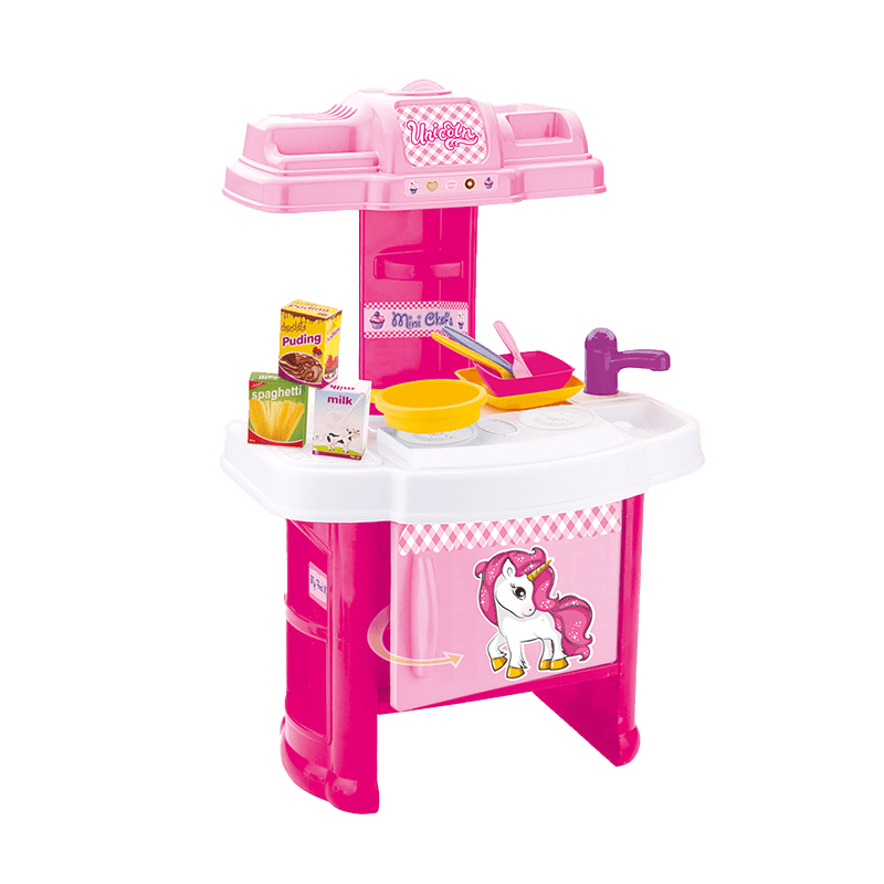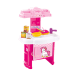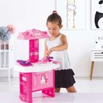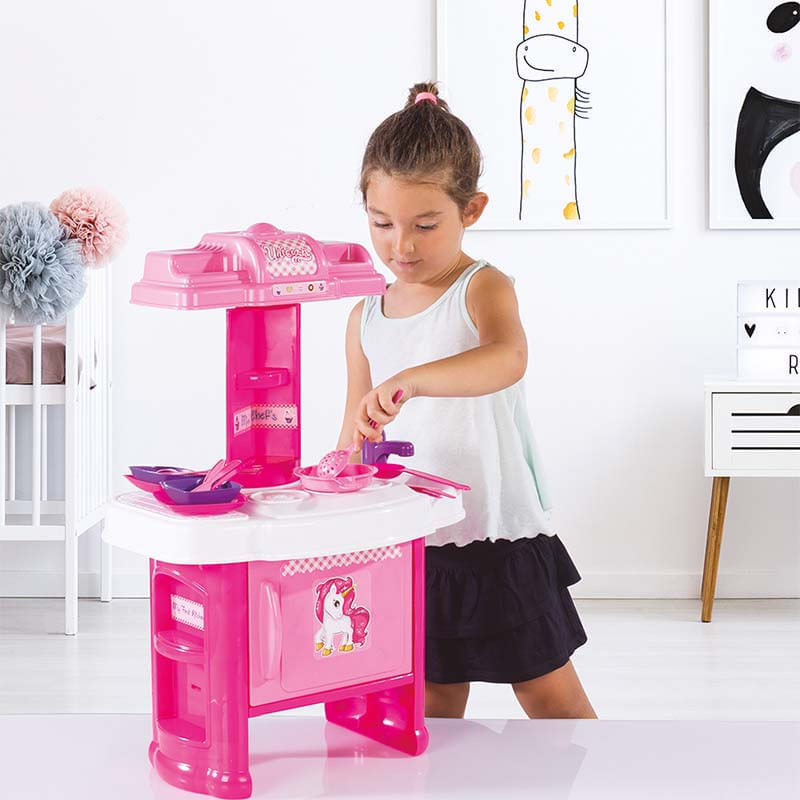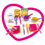 Contiene 19 piezas de accesorios. 1 cocina para armar con 2 platos planos, 2 platos hondos, 2 cucharas, 2 tenedores, 2 cuchillos, 1 cacerola, 1 sartén, 3 utensilios de cocina y 3 cajitas.